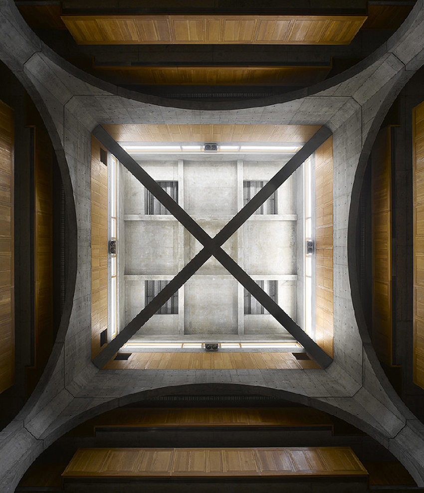 图书馆由围绕中央大空间的双重区域组成,内圈是避免直接日照的藏书区,外圈是为读者在自然光下阅读而设的区域,整个空间开放而又相对独立。建筑首层是图书馆最有魅力的地方,站在这里,你可以感受到顶部的天窗和四个圆形洞口的混凝土墙面。窗外的自然光照亮了整个屋顶,呈现出神圣的十字形,就像在瞻仰一位伟人。