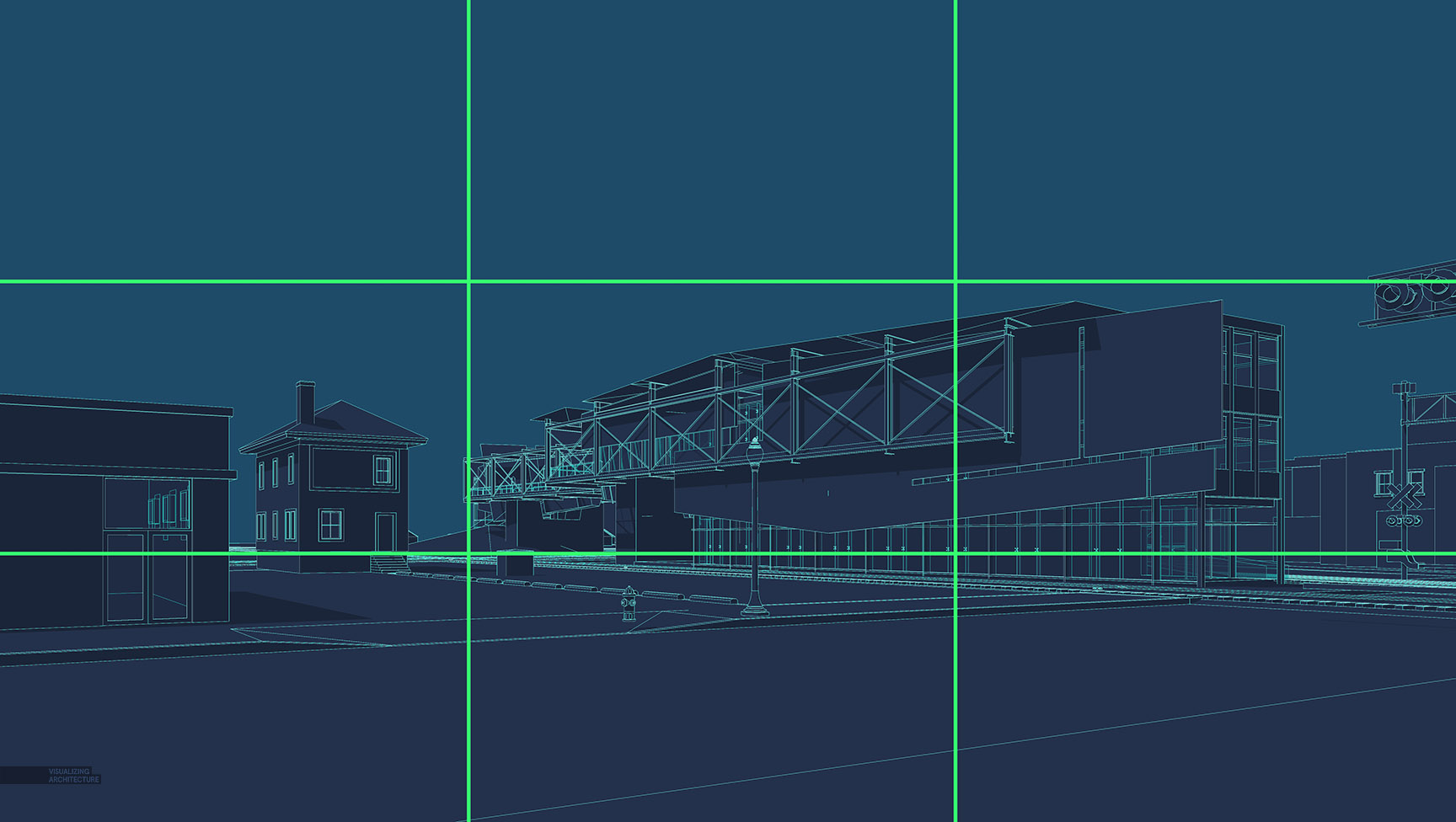 我经常将人视地平线放在画面底部三分之一处,而不是直接置于画面中心。你还会注意到一些重要元素恰好位于线上,比如尽端处的火车亭和右边的火车路口信号灯。