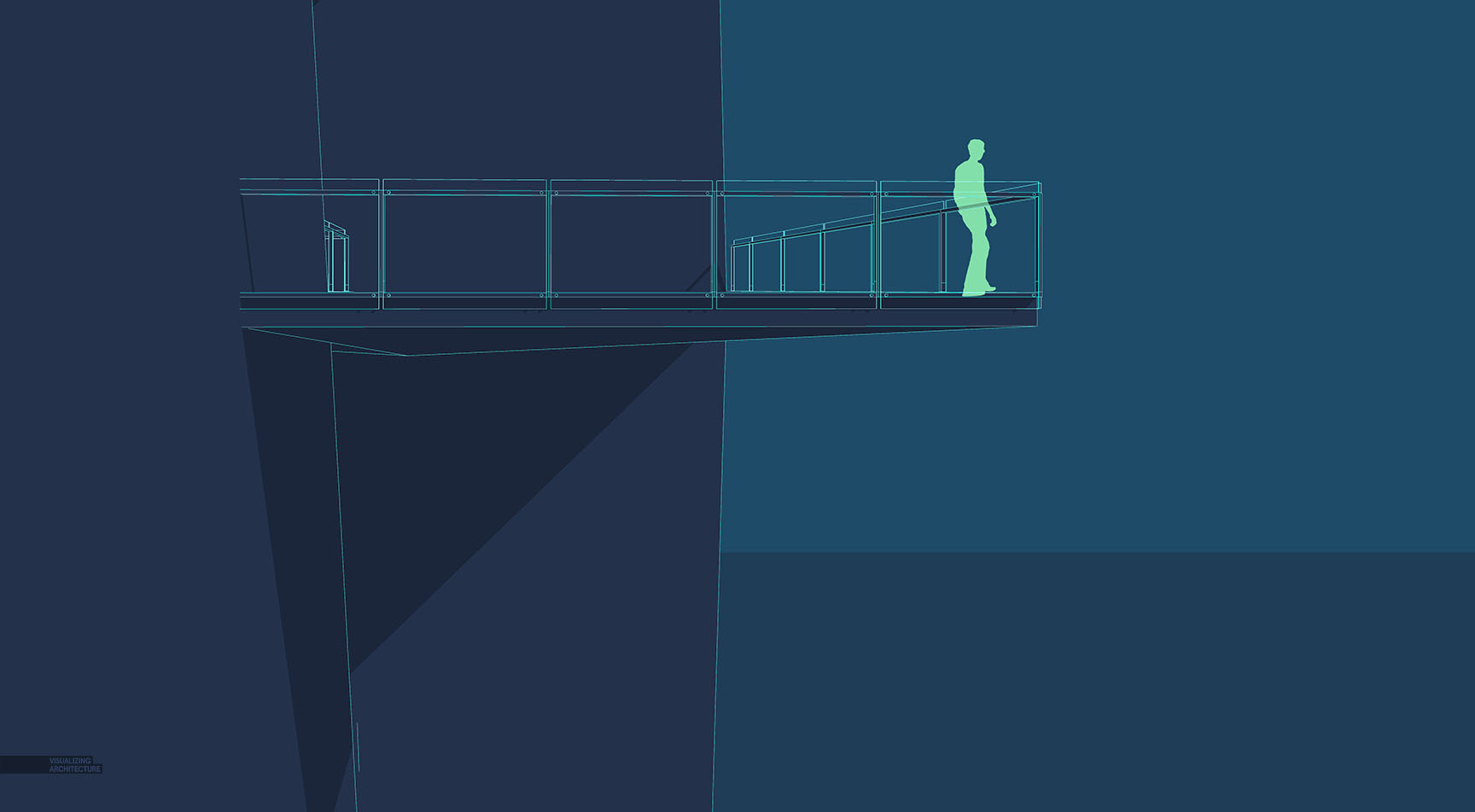 对于这张悬挑平台图,包含了许多设计元素,比如宽大的楼梯、地面水平甲板等。但是,我只专注于一个想法,那就是怎样设计一个悬挑的观景平台,从而创建出一个沉思的空间。