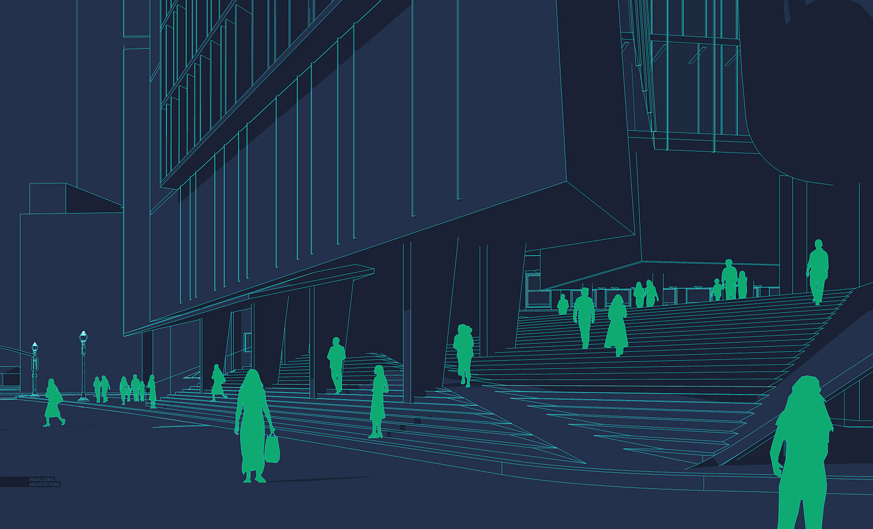 这张图始终只有一个主题焦点,就是街道如何连接到倾斜至文化中心基座上的巨大台阶。尽管如此,图中还是有一些其它元素 。