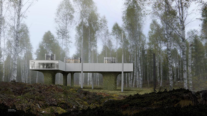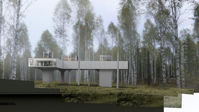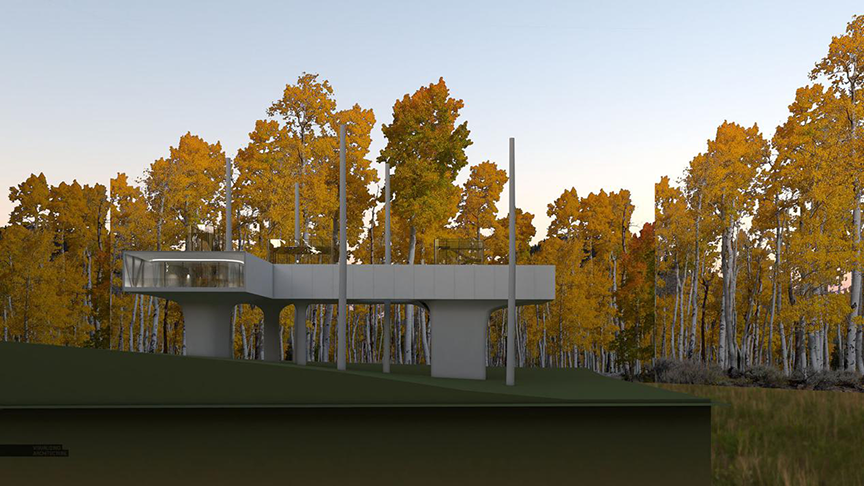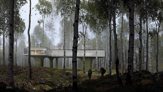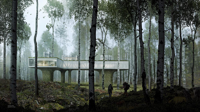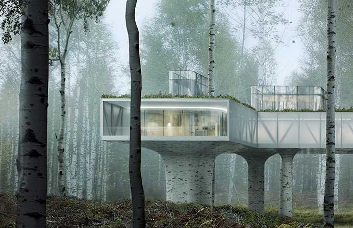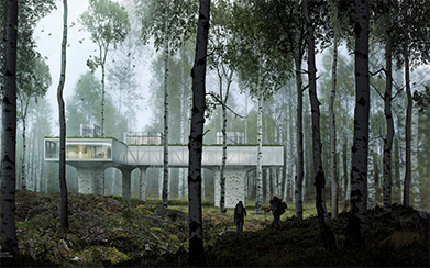 这张图在早期其实是秋天的景色,因此画面中的叶子全为黄色。我在Photoshop中将其调整成春天的样子,基地渲染图则原样保留。我还单独渲染了一张半透明墙面的效果图,以便能在Photoshop中更好地控制透明度。