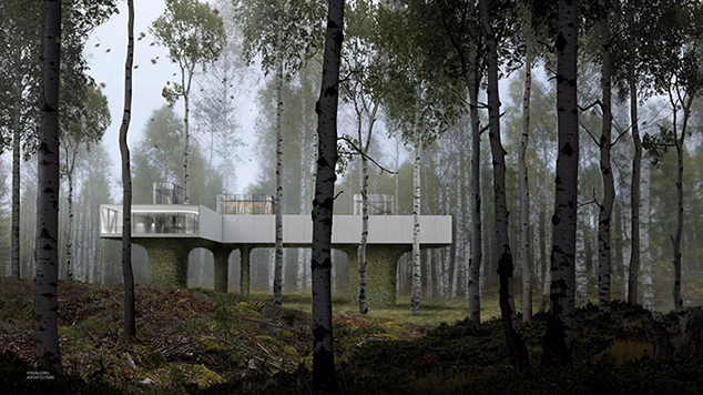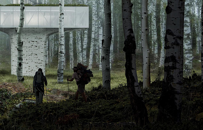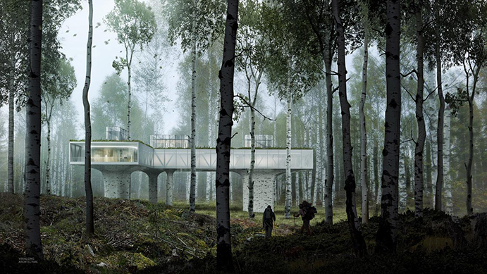 我一直在建筑材质上来回推敲斟酌,然后才意识到我需要创建一张能够允许我在视觉上前后对比的图片。形式上基本确定了之后,我仍然无法精确地在我脑海里想象具体效果。因此,我将建筑剥离出来以获得更多的周围环境,这将使我能够更好地研究建筑与环境的关系。最后,我用这张图片来为这个项目提供参考。