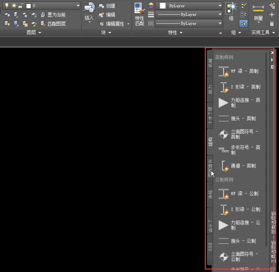 (这些是软件自带的不同行业的符号、样例,这不是今天要跟大家讲的内容。既然是妙用,就是我们自己建立一个属于自己个人习惯的工具选项板,方便我们快捷制图。)