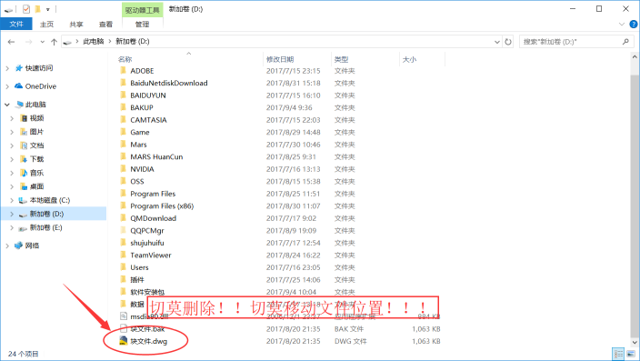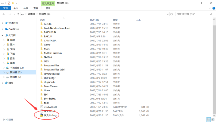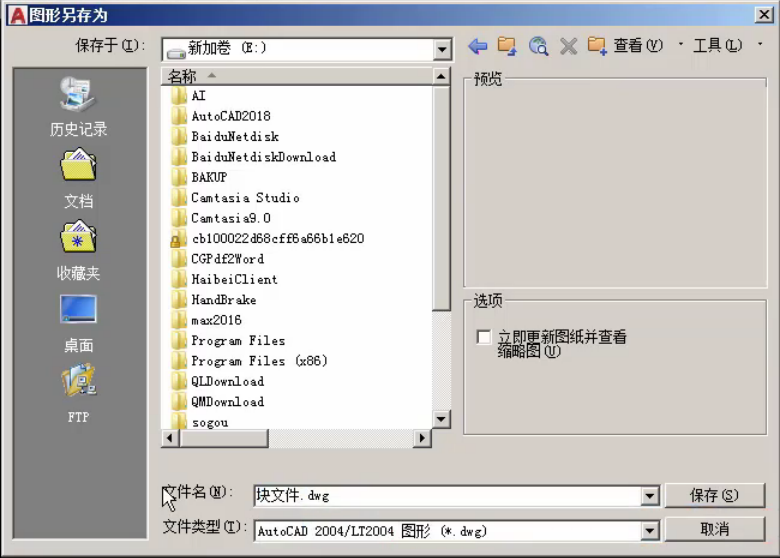 Ctrl+S保存放在了E盘,命名为“块文件.dwg”
