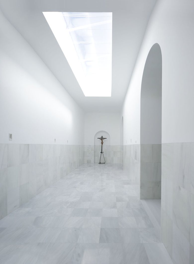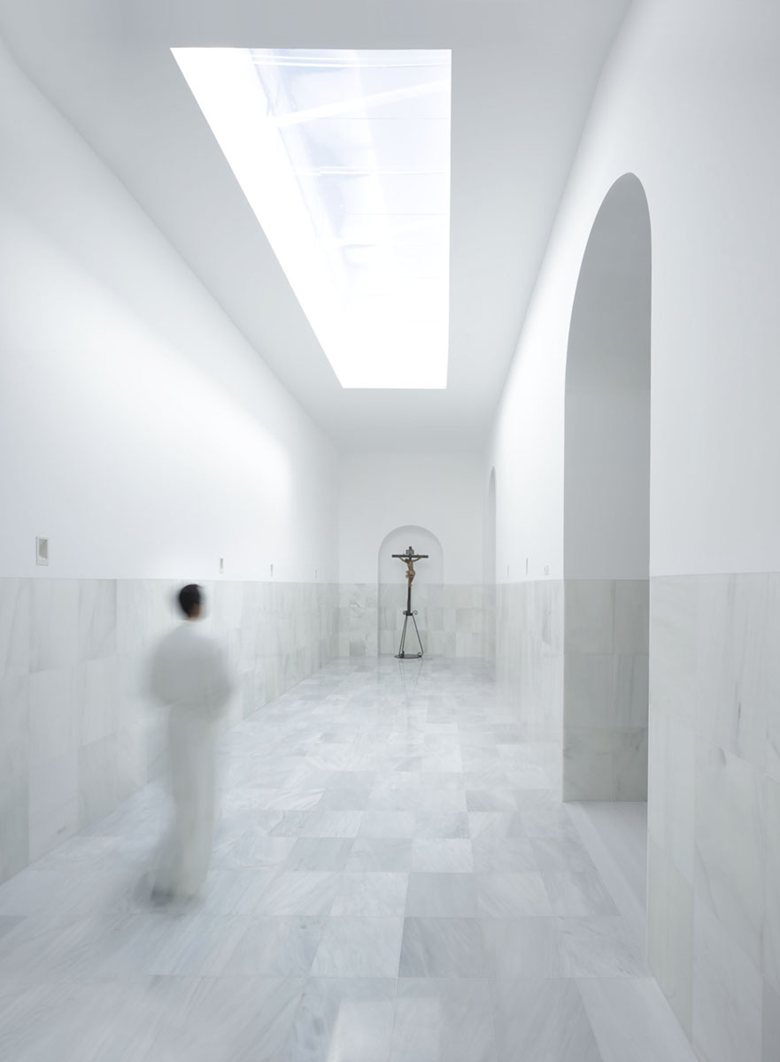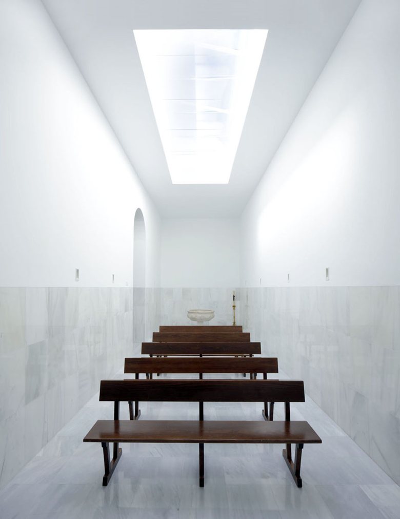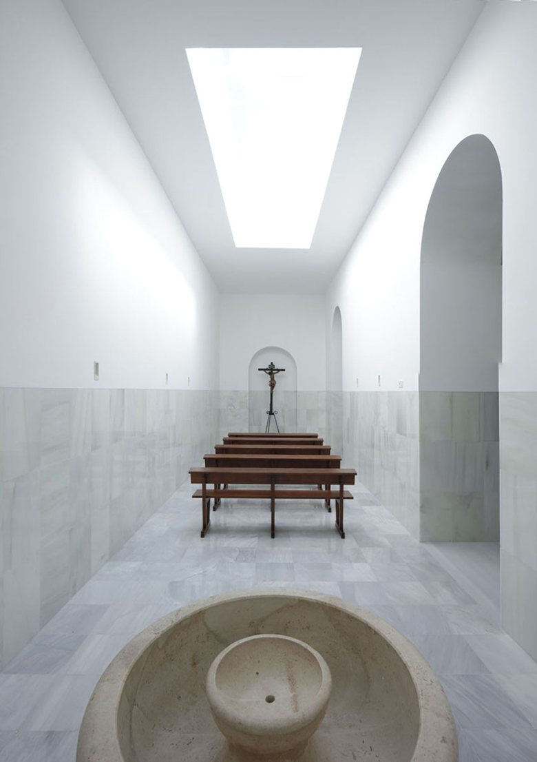 该教堂位于塞维利亚教区安达卢西亚广场,考虑到空间用于容纳圣礼是思维的一个非常具体的领域,内有一寺,万福山托兰,一个与神相会的地方。如果我们分析如何在建筑史上实现了这些空间,我们看到的是一个激进的几何意义和很强的方向性。建设这个小教堂,教堂的部分需要引入相邻的光。因此,该项目是一个独特的思考,创造一个“光箱”,是一个双重意义的含光殿,是一个地方的光以包含所有的基督教圣礼。寻找光明,可能是建筑师最重要的任务,该项目已在进行中的潜在空间因其开放的容器和天顶方向能够照亮整个教会。这样,所有的表面是白色的和干净的。按照这一标准,将剩余的土庙以一个更高的亮度展现给信徒。以下为建筑空间实景照。