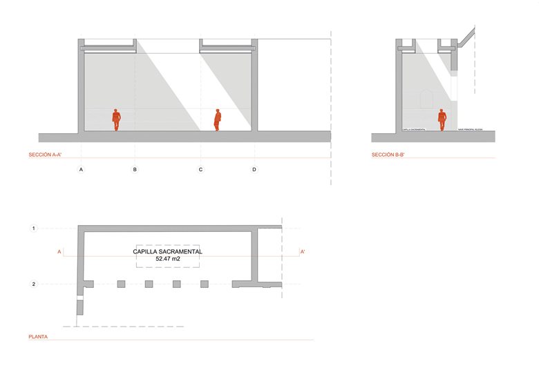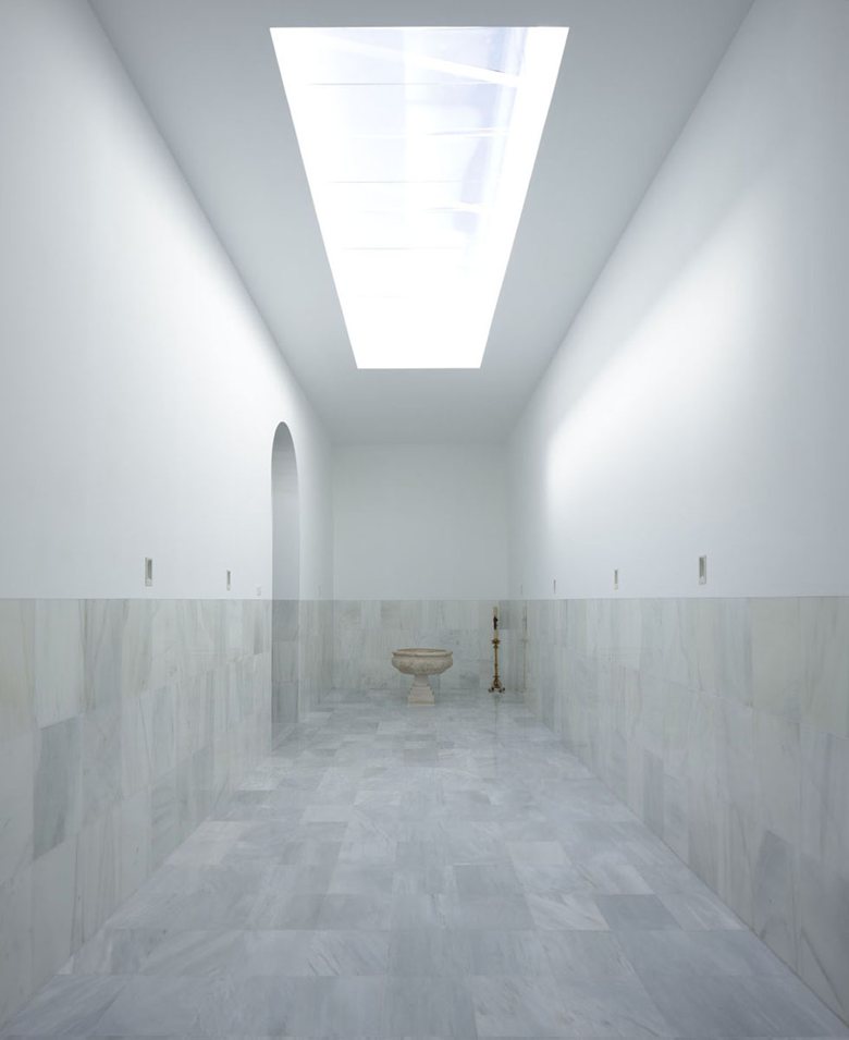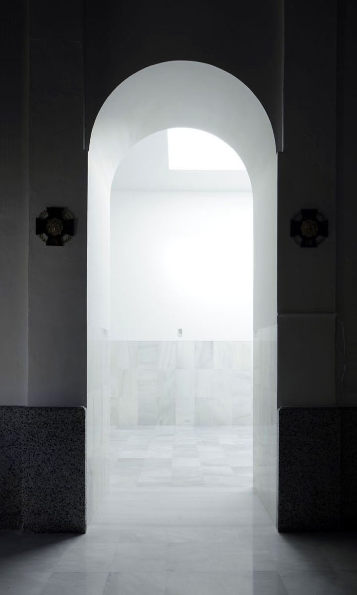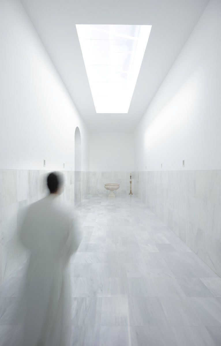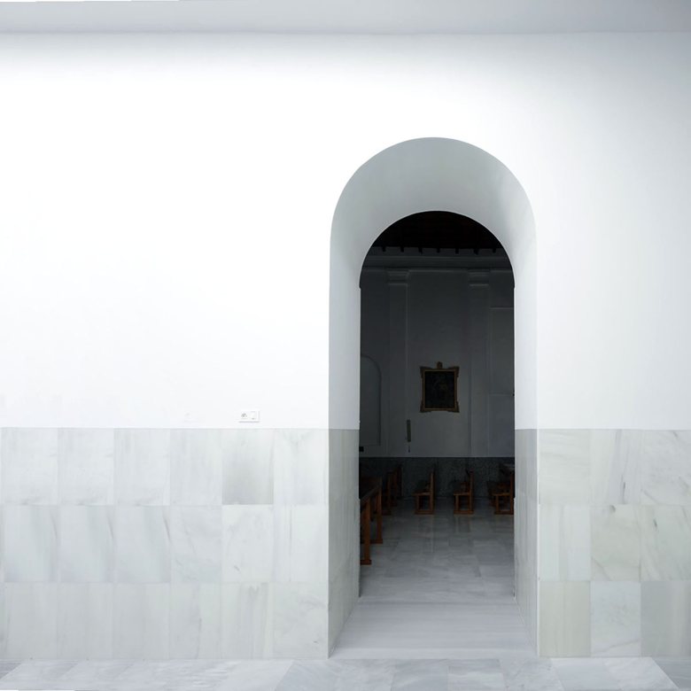 该教堂位于塞维利亚教区安达卢西亚广场,考虑到空间用于容纳圣礼是思维的一个非常具体的领域,内有一寺,万福山托兰,一个与神相会的地方。如果我们分析如何在建筑史上实现了这些空间,我们看到的是一个激进的几何意义和很强的方向性。建设这个小教堂,教堂的部分需要引入相邻的光。因此,该项目是一个独特的思考,创造一个“光箱”,是一个双重意义的含光殿,是一个地方的光以包含所有的基督教圣礼。寻找光明,可能是建筑师最重要的任务,该项目已在进行中的潜在空间因其开放的容器和天顶方向能够照亮整个教会。这样,所有的表面是白色的和干净的。按照这一标准,将剩余的土庙以一个更高的亮度展现给信徒。以下为建筑空间实景照。