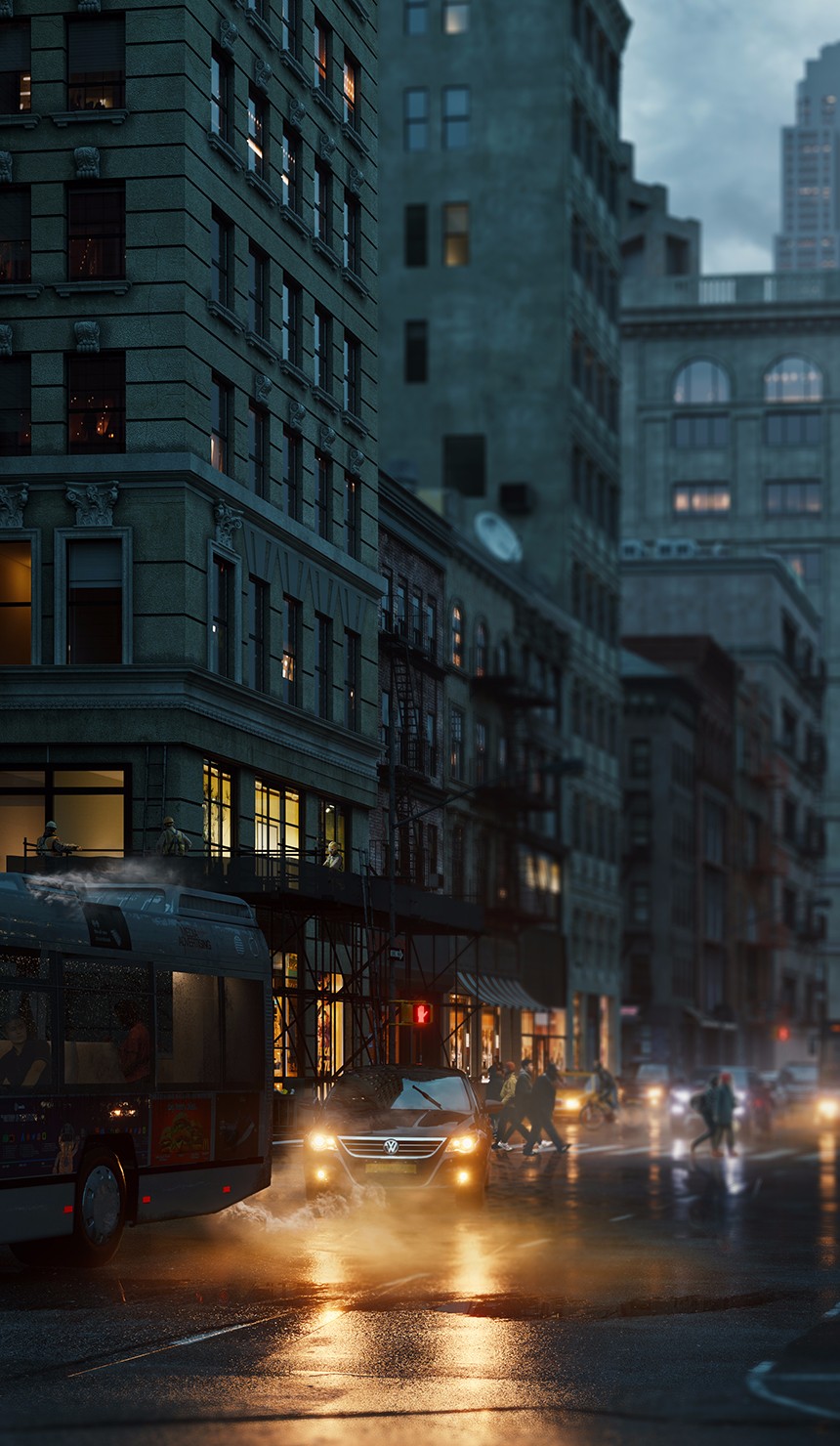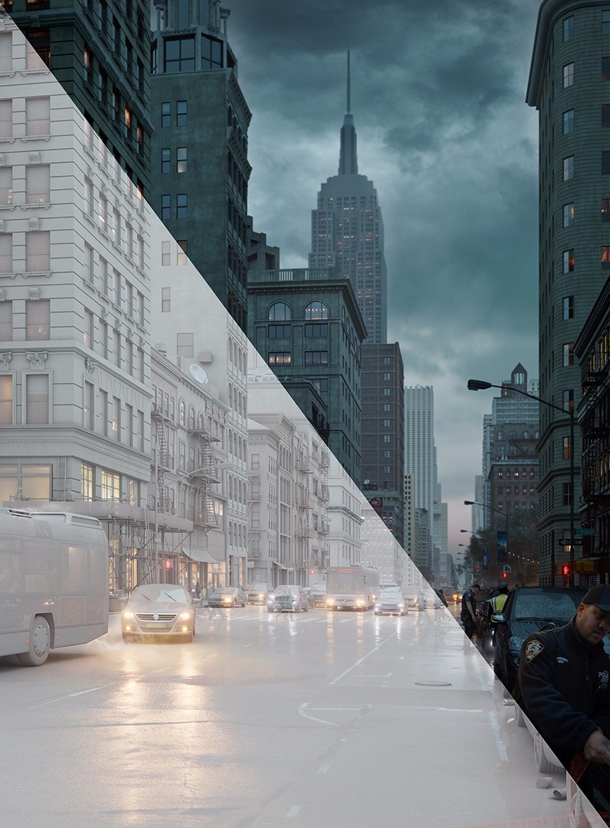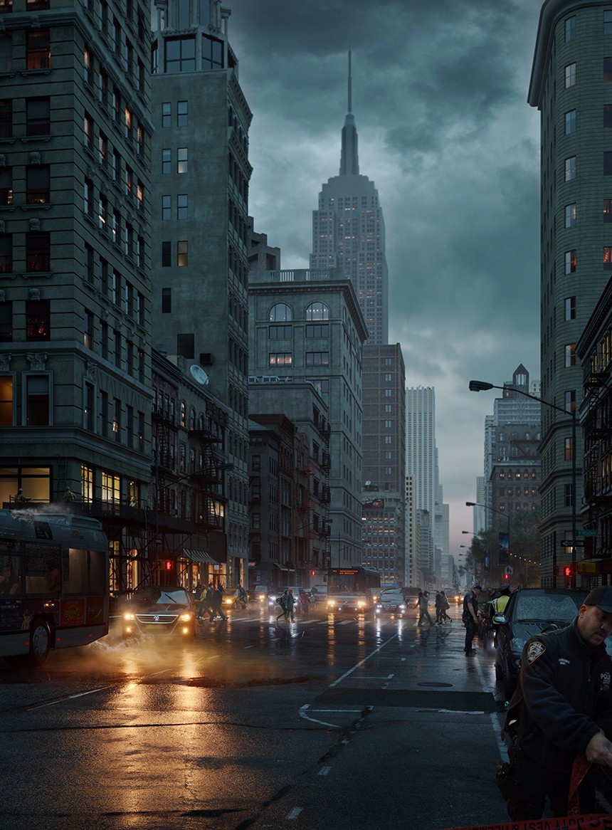 作者寻找一些有趣的街道视角作为创作参考资料,而关于第五大道的图片引起了他的注意,并以此为原型设计了场景,并试图尽可能尊重原建筑物和环境。