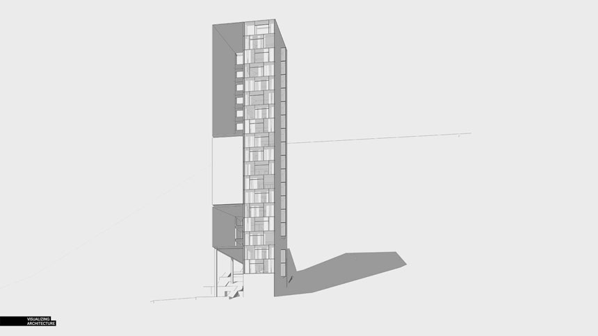 由于建筑是高层的,所以整体构图比较容易确定。在ps中画布比例为垂直布局。