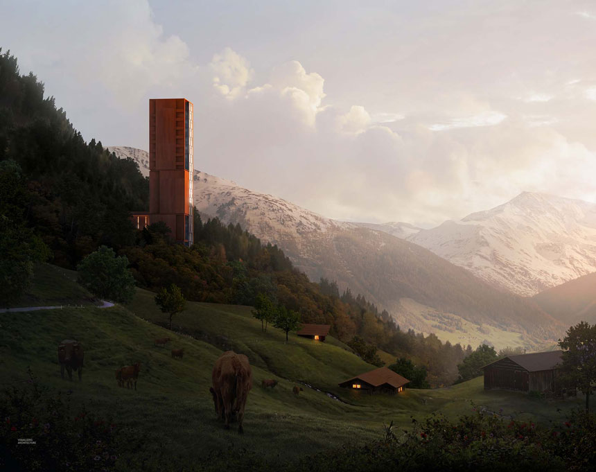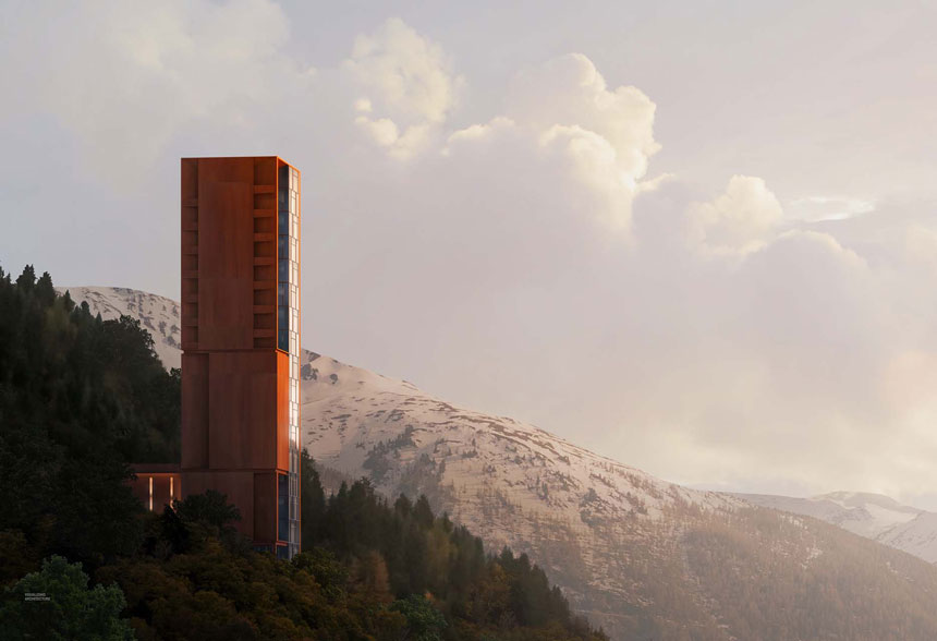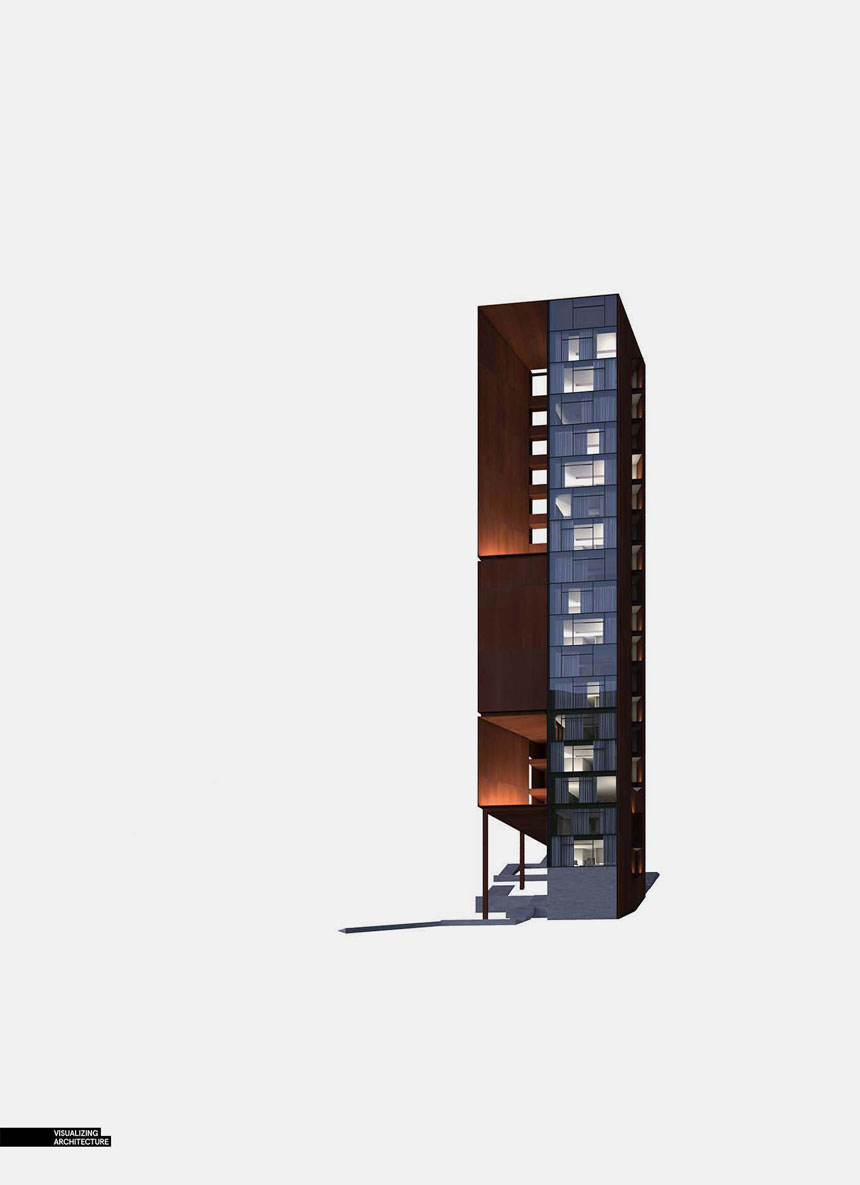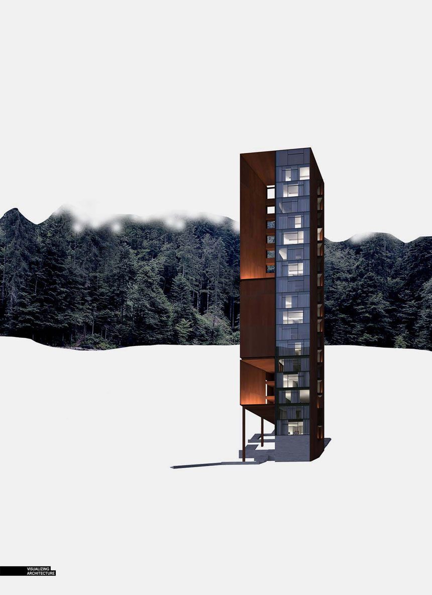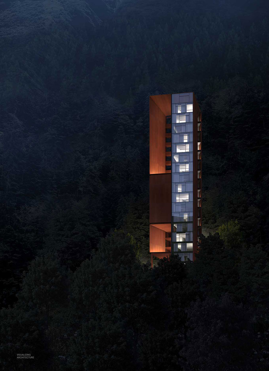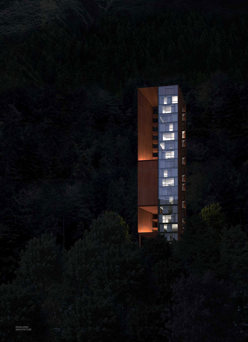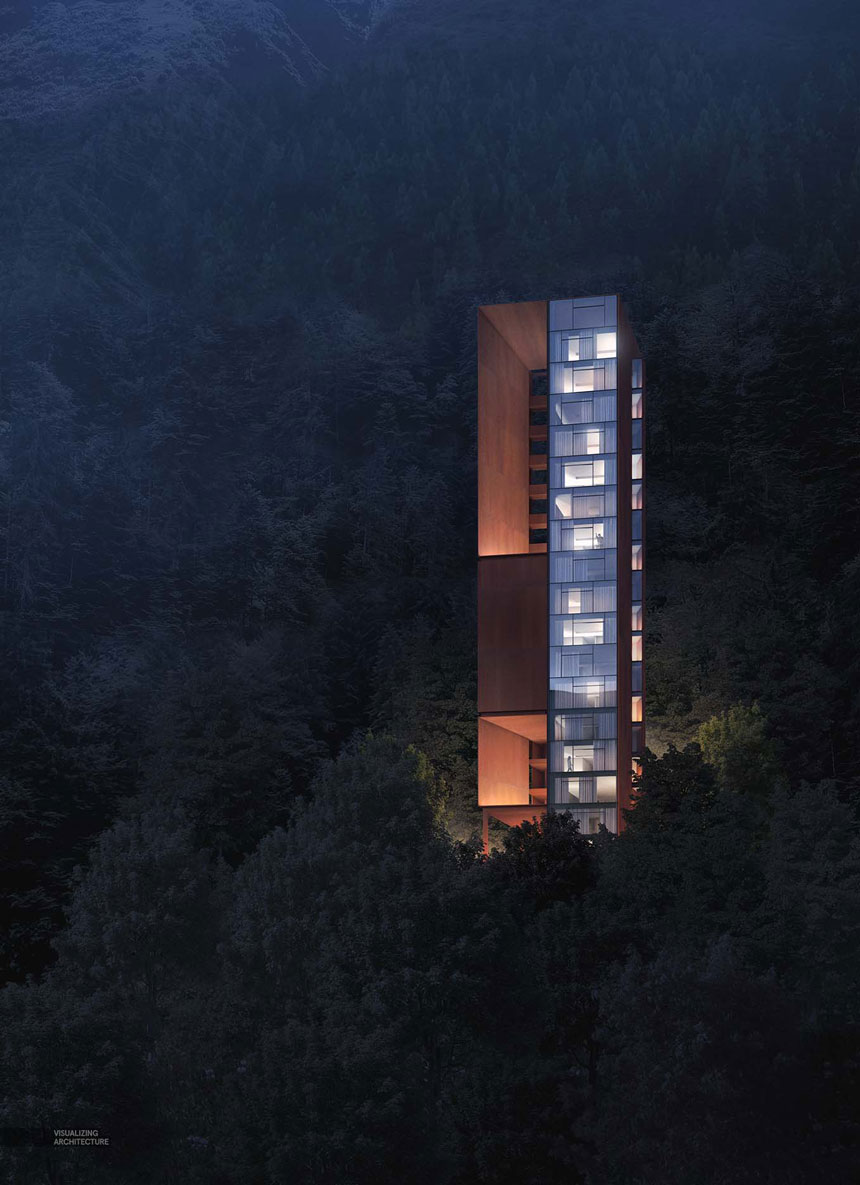 作者对于此次的建筑表现,只是快速选择一些构图,将它们渲染出来,然后在围绕体系结构与周围环境的相互关系来进行后期制作。作者对于这两张图,想传达一种安静和沉思的想法。从内部灯光开始到渲染完成,最后后期制作完成,最终用了4个小时。