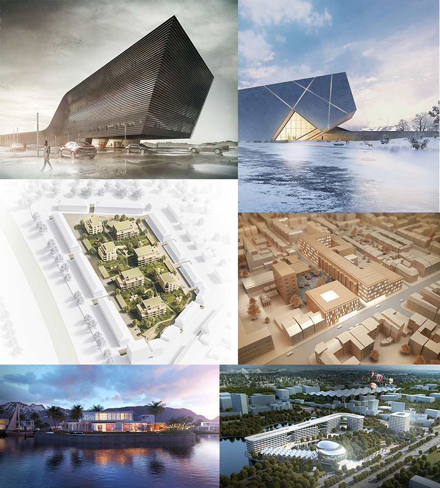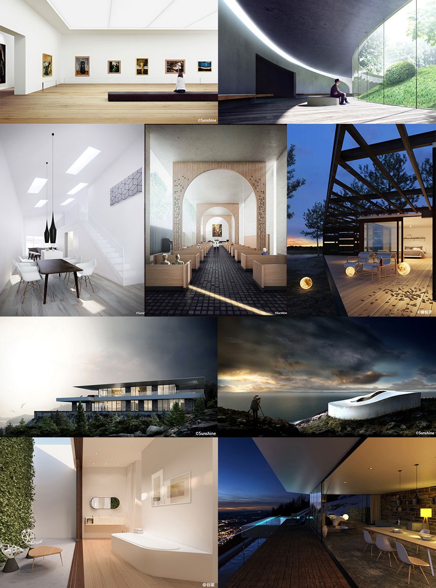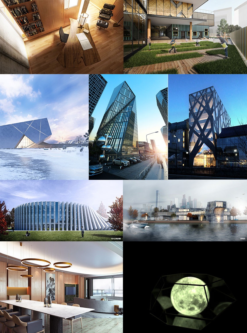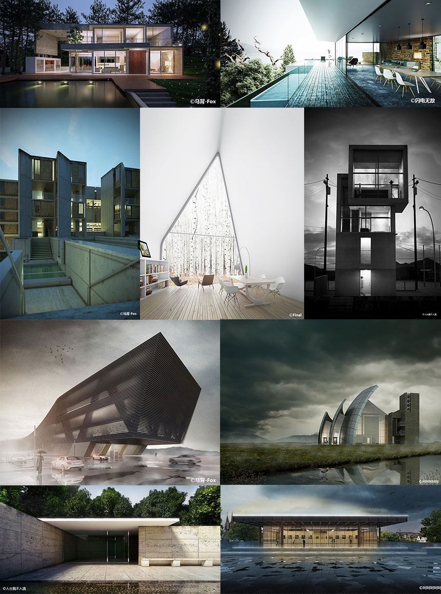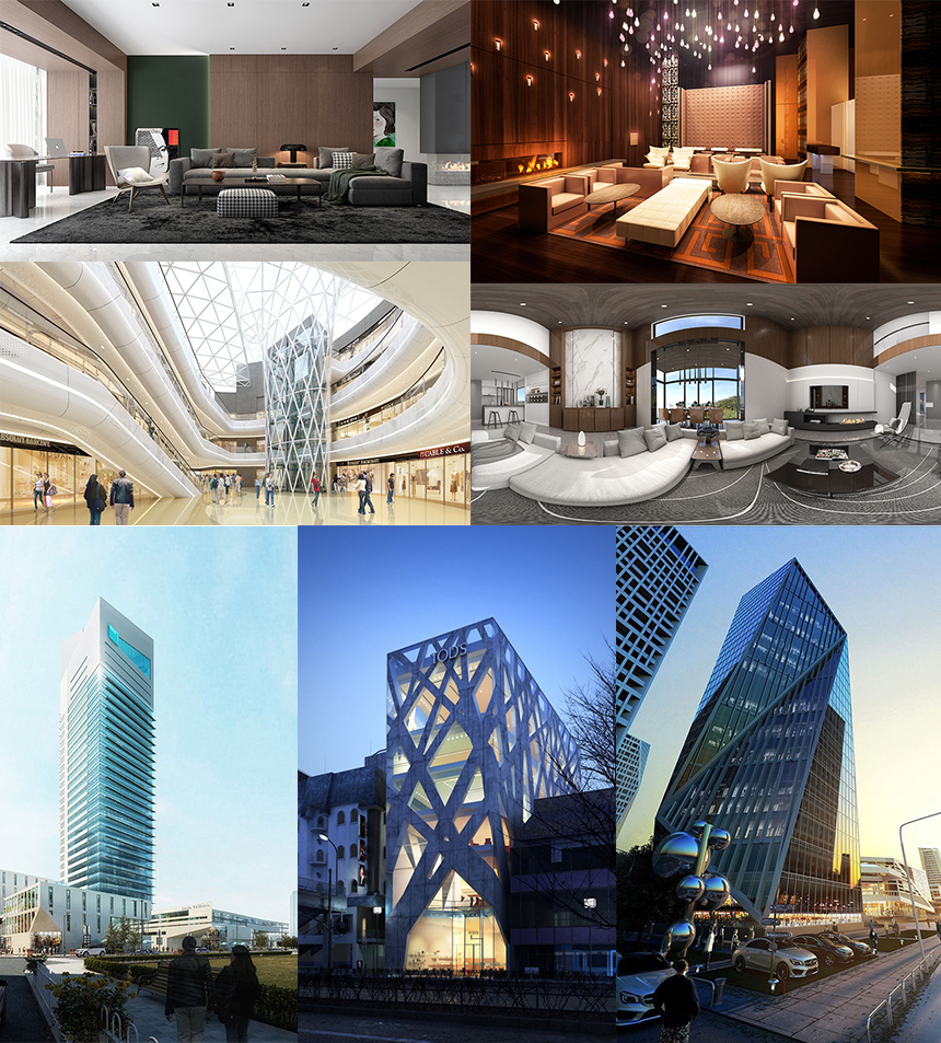 商业案例包括日景、阴天、夜景、黄昏、雾效、雨景、雪景等情景表现,也包括鸟瞰、360、风格化等案例表现