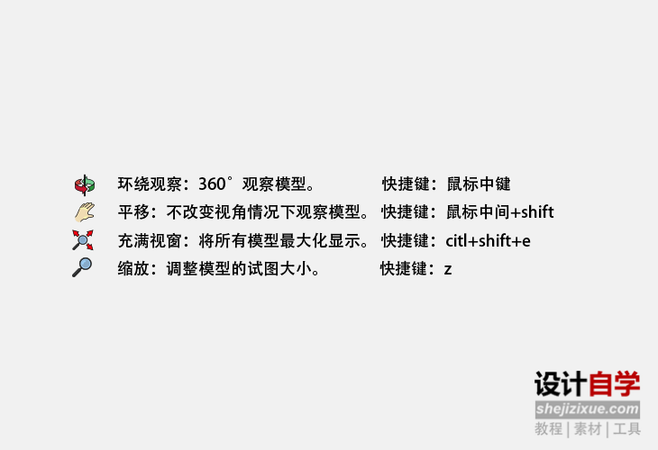 然后我们来看平移,平移工具的作用是在不改变视角的情况下平行移动试图,在模型比较大且不想改变视角的时候这个工具很有用,它等效于鼠标中间+shift。