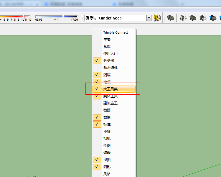 1.打开sketchup pro,在工具栏上点鼠标右键调出大工具集。