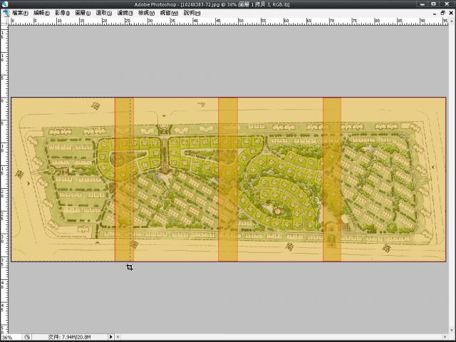 至此,我们可以很直观的看出将底图分为四张小图是最理想的分割方式。将这四个图框图层合并为一层,将底图裁切成四块并另存为JPG图片。