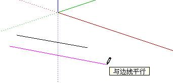 线 会变成红色,并显示[在轴上]之选取提示,这个对于想要绘制正确模型有相当大的帮助,是非常强的功能。在点取线的终点前,请试着稍微移动线,注意线会变成 黑色,现在移动指标让这条线与第一条线平行,线会变成粉红色,表示与第一条线平行的[与边线平行]的选取提示会显示出来: