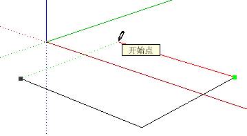 接 着拉出与红色轴平行的第三条线,这次不要在数值控制框中输入长度运用SketchUp的推定线功能。将第三条线往绿色轴方向拉,如果线变成红色即确定拉出 与红色轴平行的线,当这条线的长度与第一条线长度相同时,连接第一条线端点(此时为开始点)与目前拉出的线终点的虚线会出现,并显示[开始点]选取提示, 这样表示第三条线终点与第一条线端点是对齐的,请点取此点。