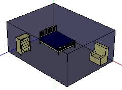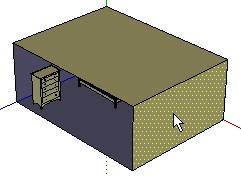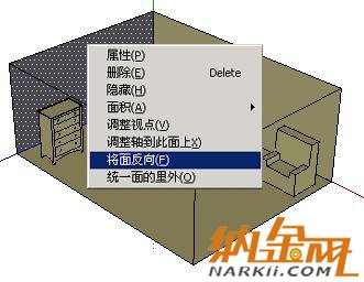 如果模型的显示模式不[产生阴影]时,请设定[产生阴影]。将[选取]工具置于面的上方,按鼠标右键选取[将面反向]。针对模型的墙与地版同样进行[将面反向]。